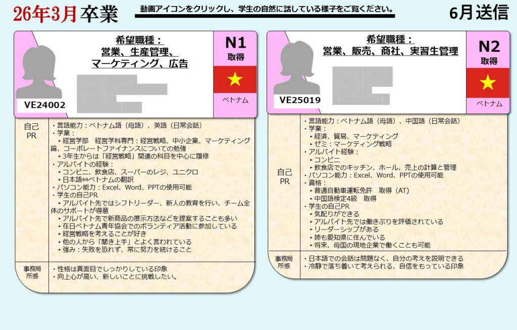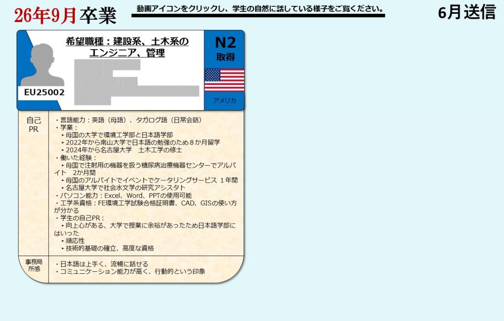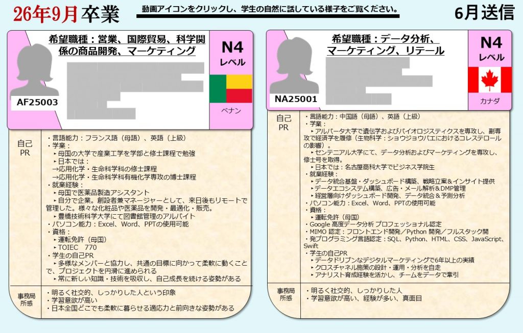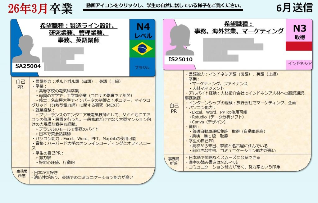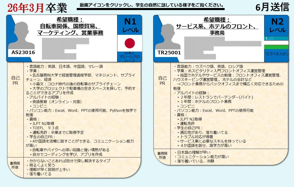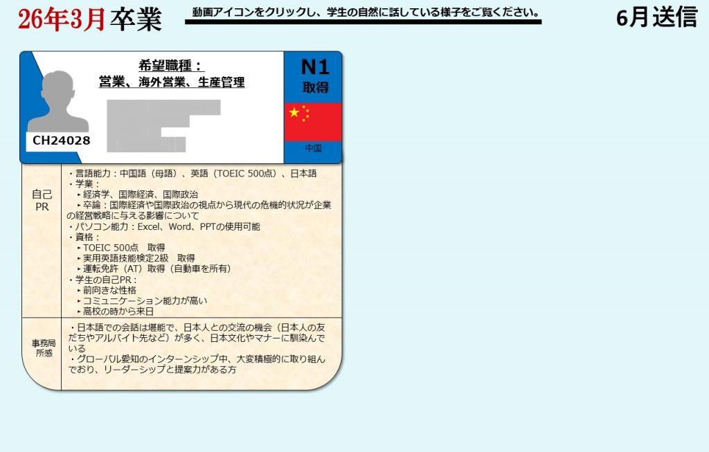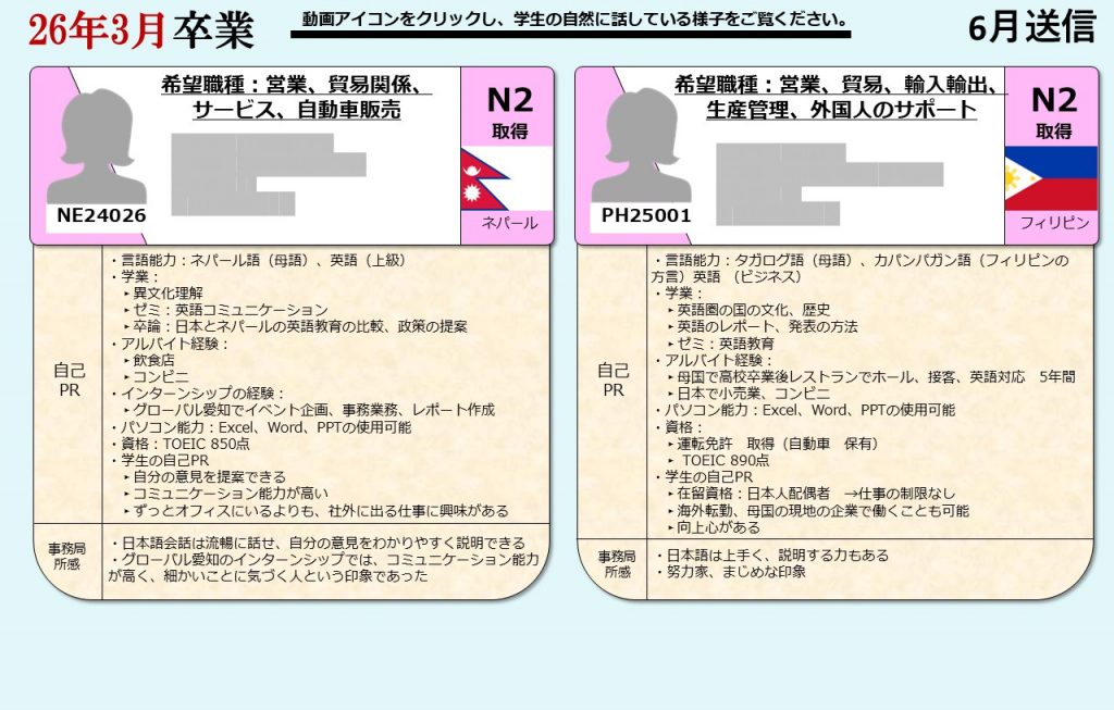 グローバル愛知は、愛知県の留学生を中心に全国の留学生に向け、就職支援を提供しております。毎月留学生向けに就活オンライン相談会を開催し、就職に困っている留学生たちにアドバイスをおこなっています。そして相談会に参加した留学生の情報は、会員企業に向けて求職者情報として定期的に発信しています。