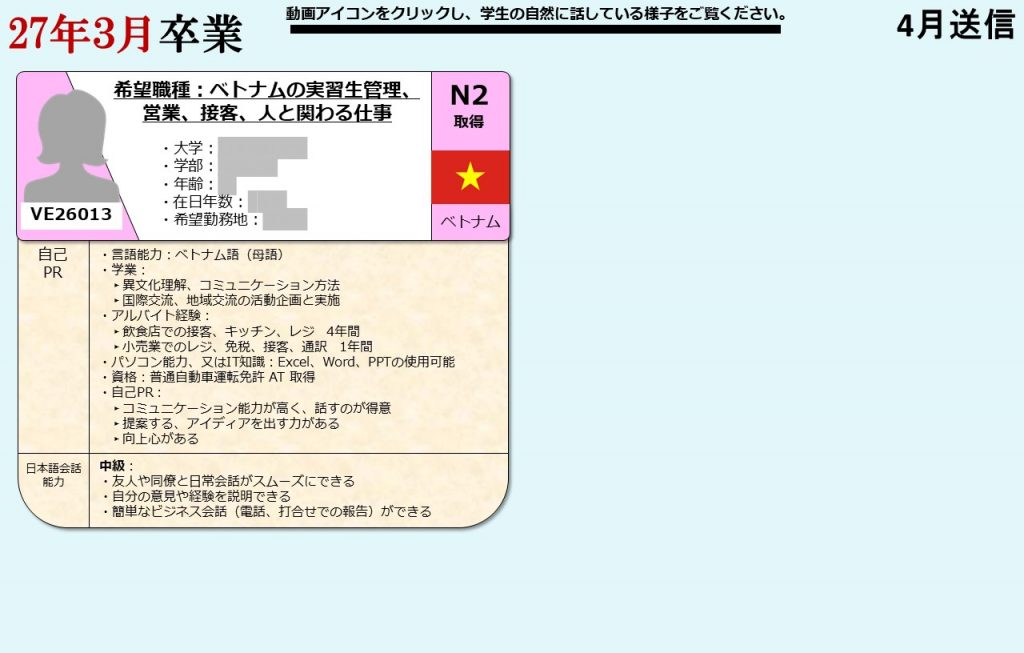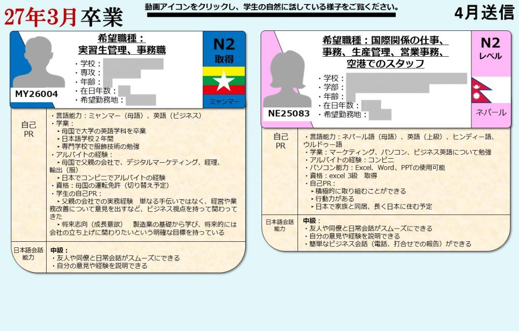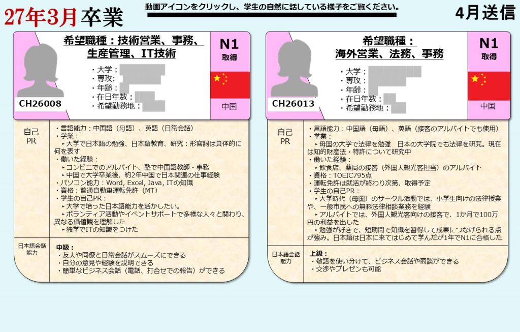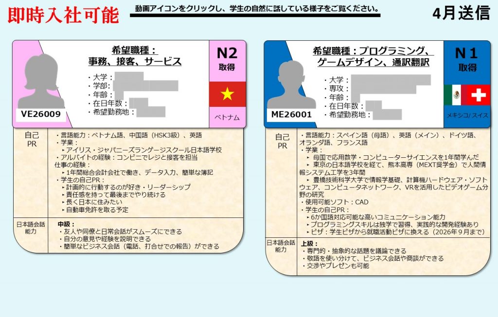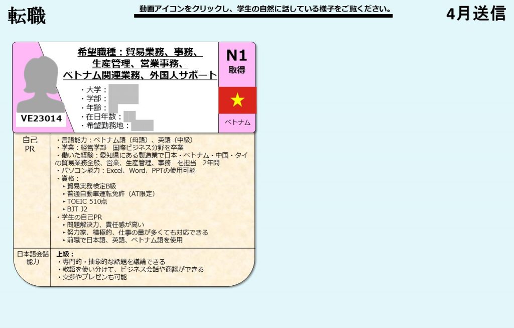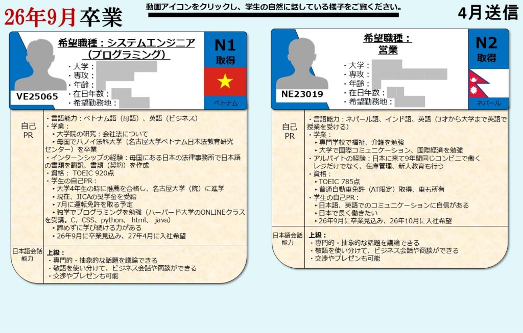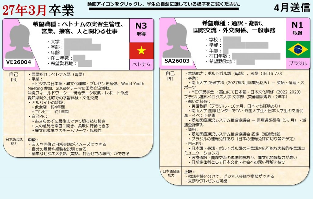 グローバル愛知は、愛知県の留学生を中心に全国の留学生に向け、就職支援を提供しております。毎月留学生向けに就活オンライン相談会を開催し、就職に困っている留学生たちにアドバイスをおこなっています。そして相談会に参加した留学生の情報は、会員企業に向けて求職者情報として定期的に発信しています。